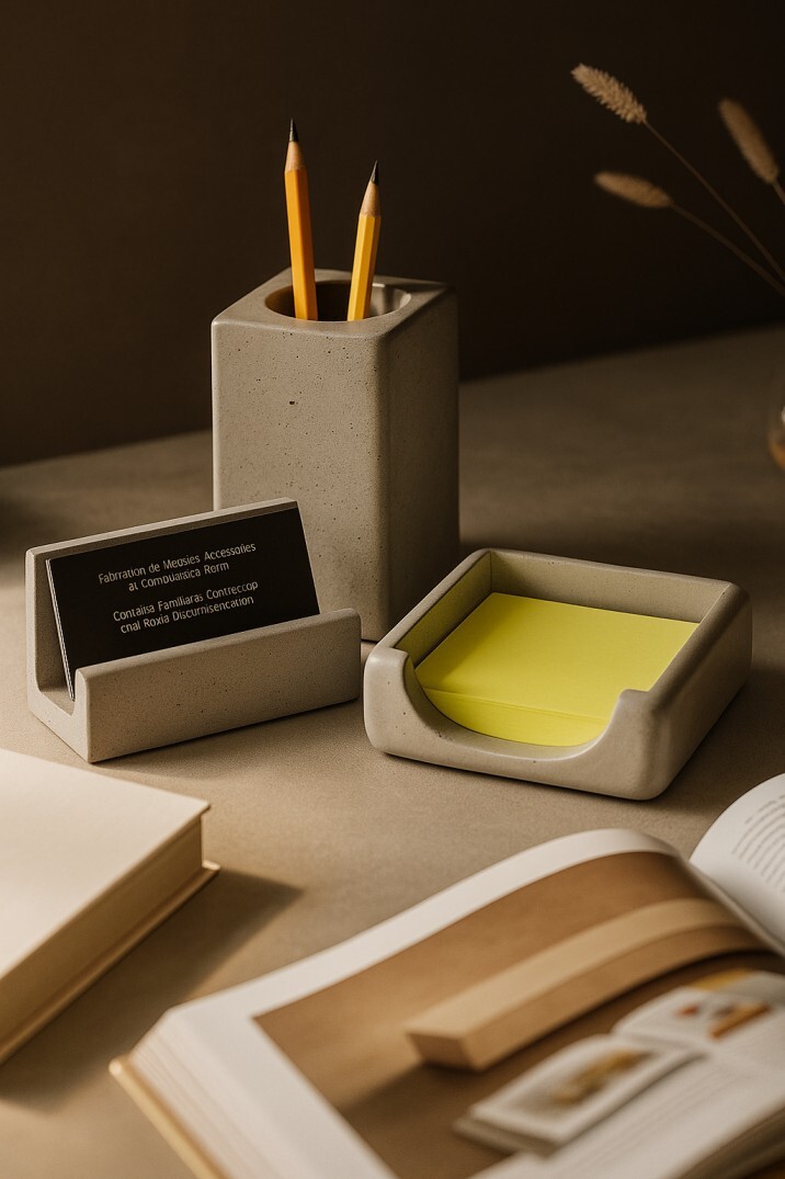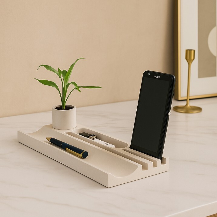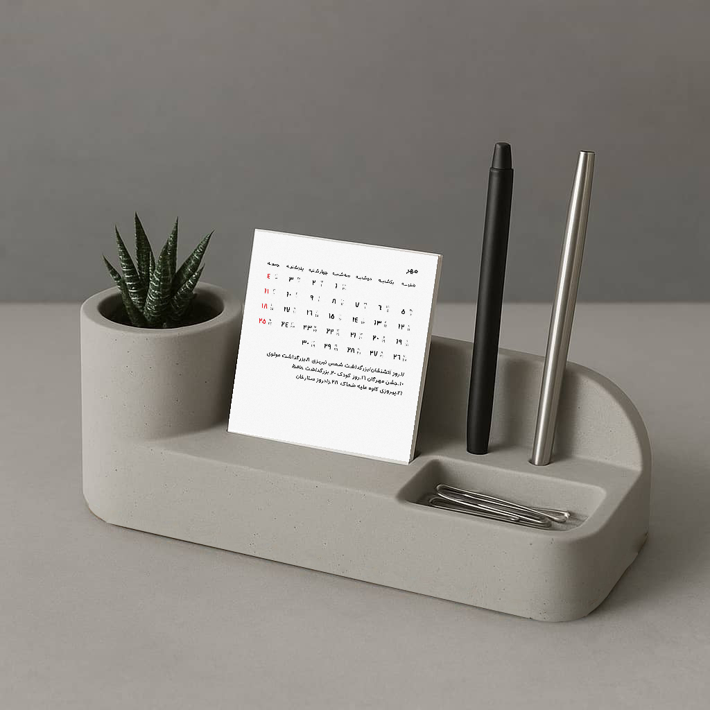 این ست شامل گلدان، تقویم، جای قلم و محفظه‌ی وسایل کوچک میز است و با طراحی خاص خود، همه‌ی عناصر ضروری میز کار را در یک مجموعه جمع‌آوری می‌کند.